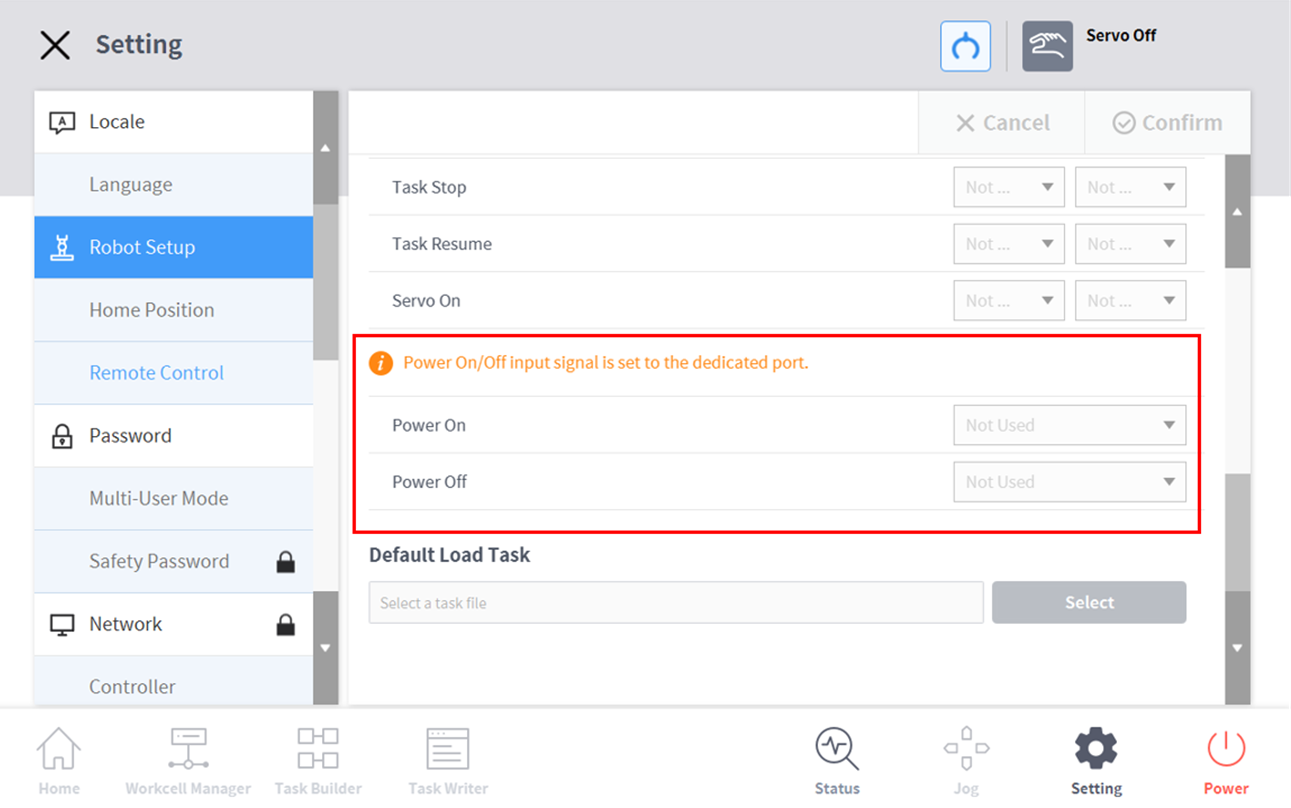 - Select the Remote Control menu in the Setting > Robot Setup menu.