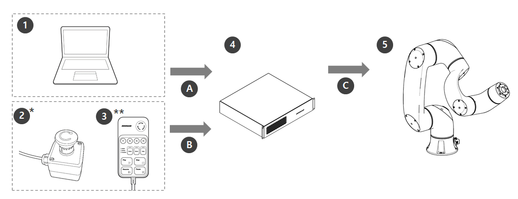 | 2 | Emergency Stop Button* | If a laptop is used as part of the system, it acts as the emergency stop button of the teach pendant. |