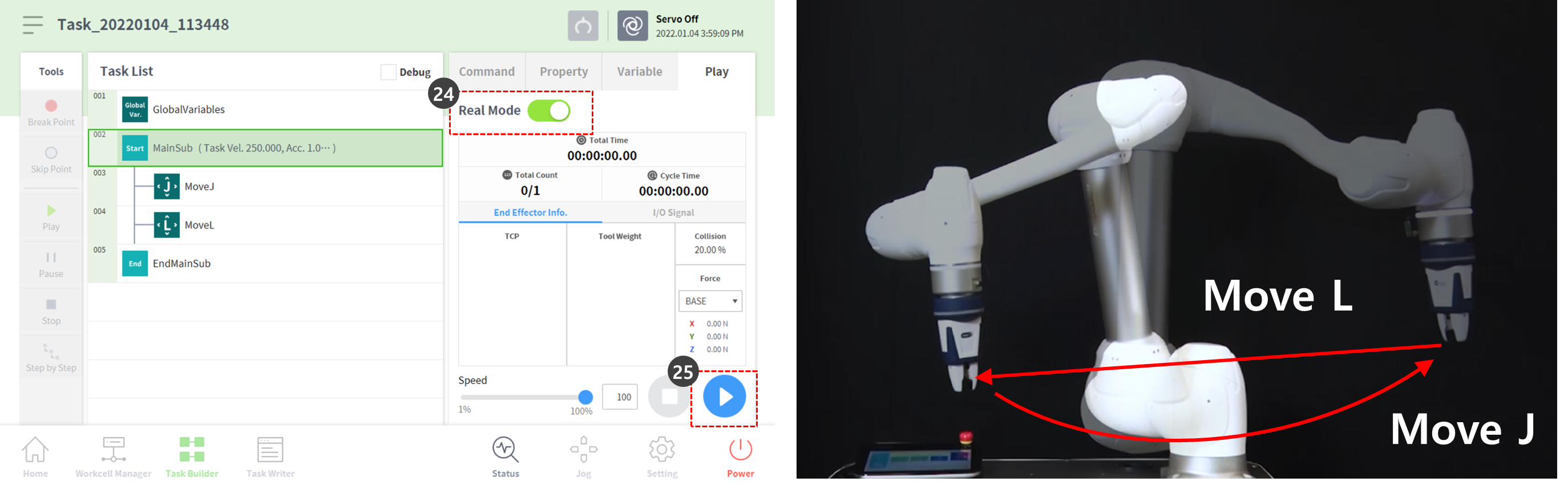 In this sample, add MoveJ and MoveL commands in the Task Builder, execute them and compare the difference between the two motions.