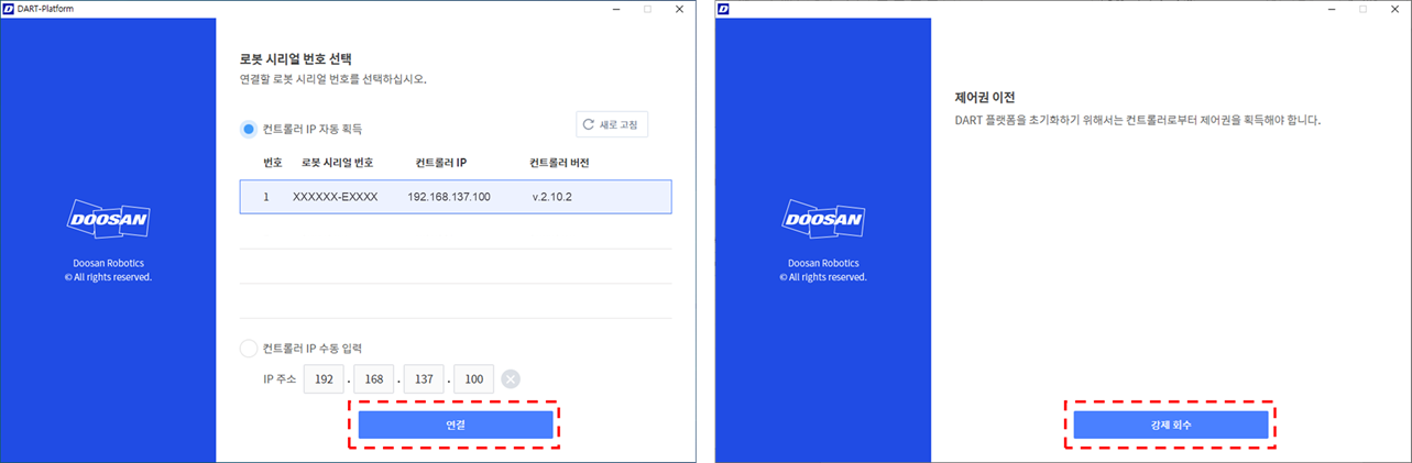 The DART Platform displays a screen that shows the robot connected to the network after booting, and the process of checking the robot’s serial number and connecting to the robot take place on this screen.