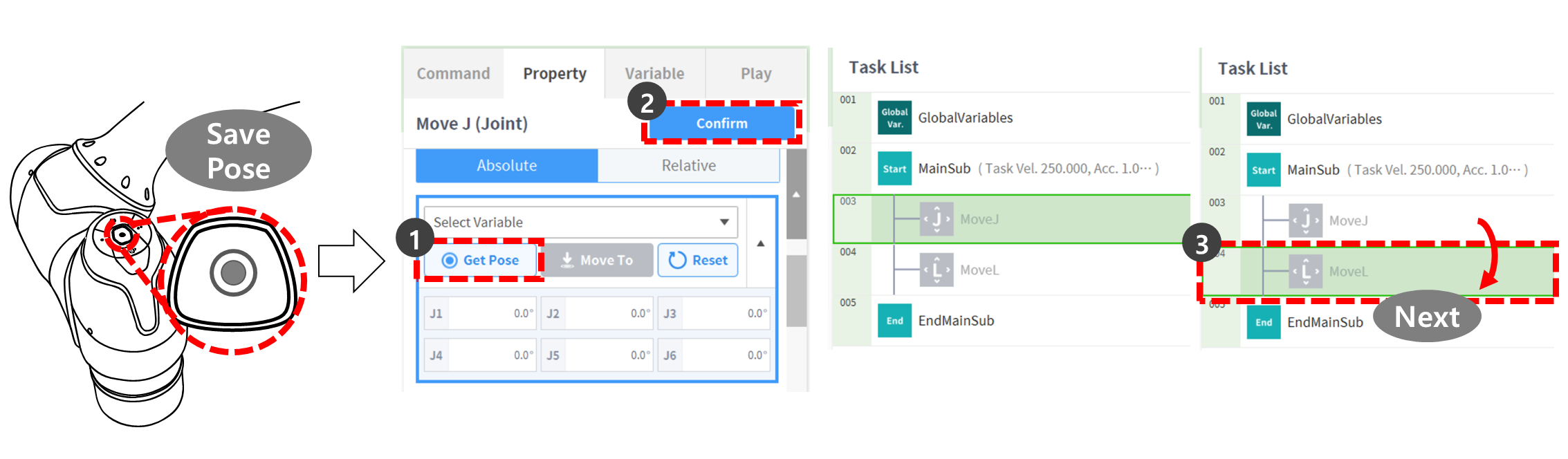 There is no need to select MoveL of the task list. If the save pose button is pressed, the task list automatically moves to the task line.