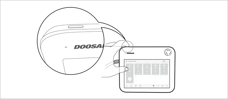 - Press the shutdown button on the teach pendant or press and hold the power button on the upper left of the teach pendant for 2 seconds.