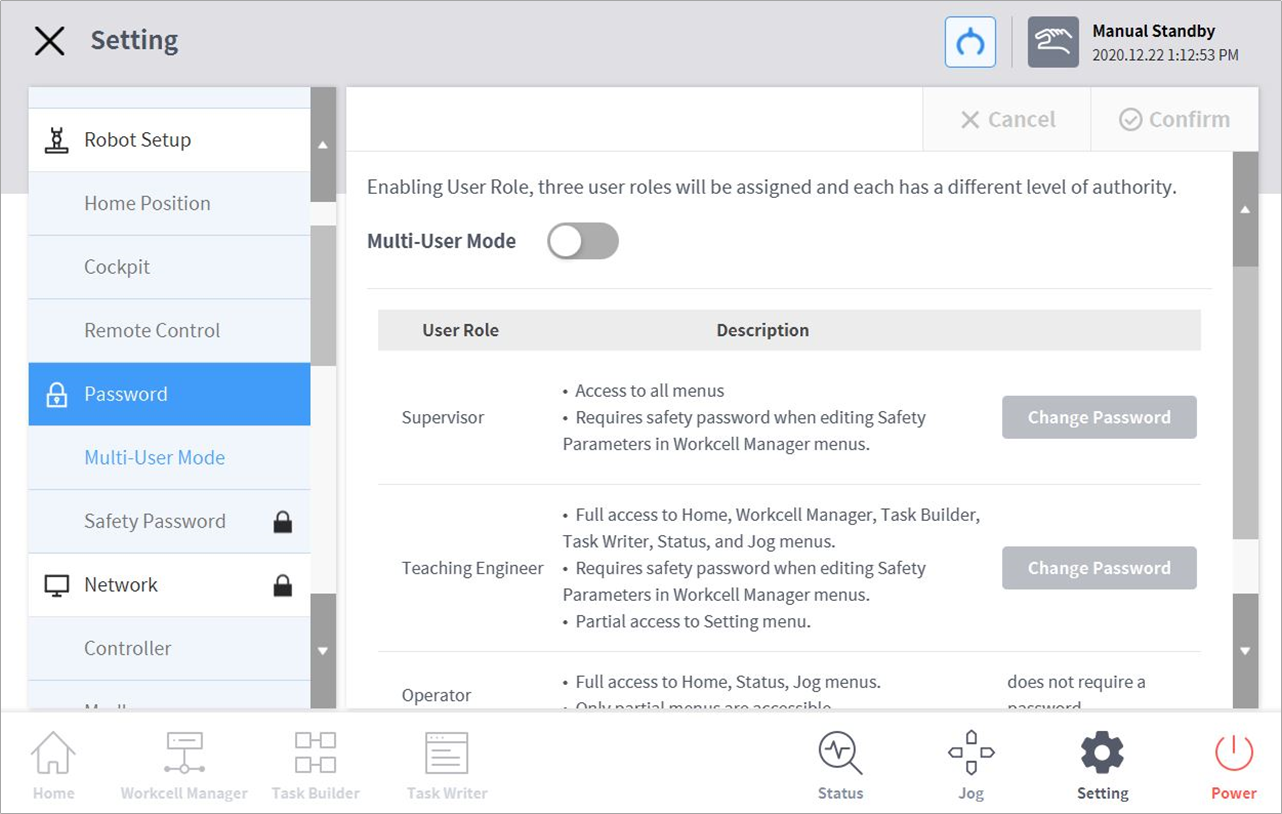 - When user authority is changed from Off to On, the screen returns to the Home screen and changes to operator role.