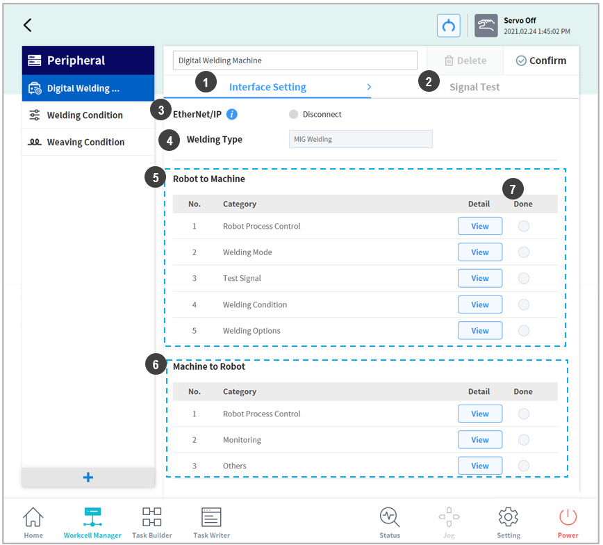 ‘Signals’ set and activated from Interface Settings menu are linked to functions related to welding conditions and welding task settings, so they must be set first. After completing the physical interface setting of Arc Welding Overview, go to Workcell Manager → Peripheral → Welding menu to set settings according to the following.
