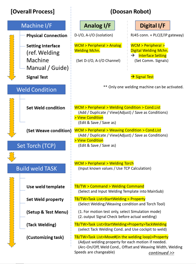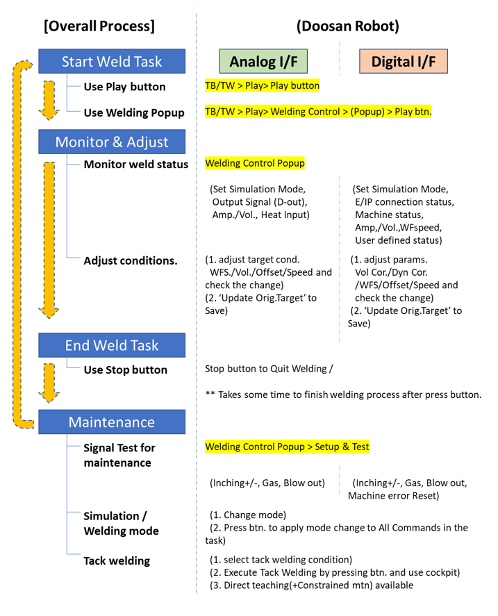 The starting process of the robot-welder connection for welding automation will lead to repeated welding work performed by welding personnel in the following general order. In this flow, the initial connection and setting is sometimes performed by a professional system integrator (SI), and the setting of welding conditions requires specialized knowledge about welding. In particular, electrical insulation must be checked and the surrounding environment organized prior to welding work in order to prevent fires. The right side of the below flow chart shows the functional menus offered by Doosan Robotics. Please refer to the simplified diagrams to more easily use the welding features. Detailed explanations of each menu will be provided in following chapters/paragraphs.
