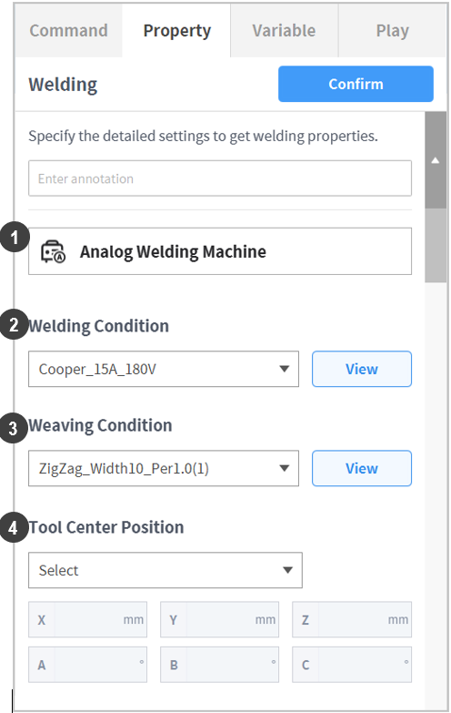 2 | Select Welding Condition | Select a condition from the welding condition list. To perform a task without activating the welding machine, movement speed (MoveSpeed) must be entered.