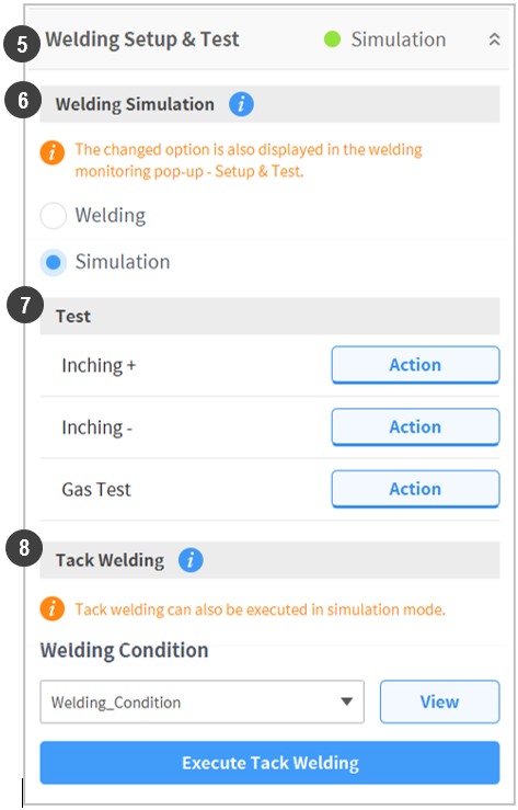 8 | Tack Welding | Select and perform a tack welding condition. A separate popup window will be displayed, and the button in the cockpit can be used. |