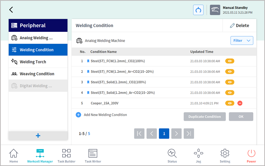 It is possible to create a new welding condition or modify/delete an existing welding condition. In addition, all welding conditions can be checked in a list, and they can be searched and sorted using the filter function.