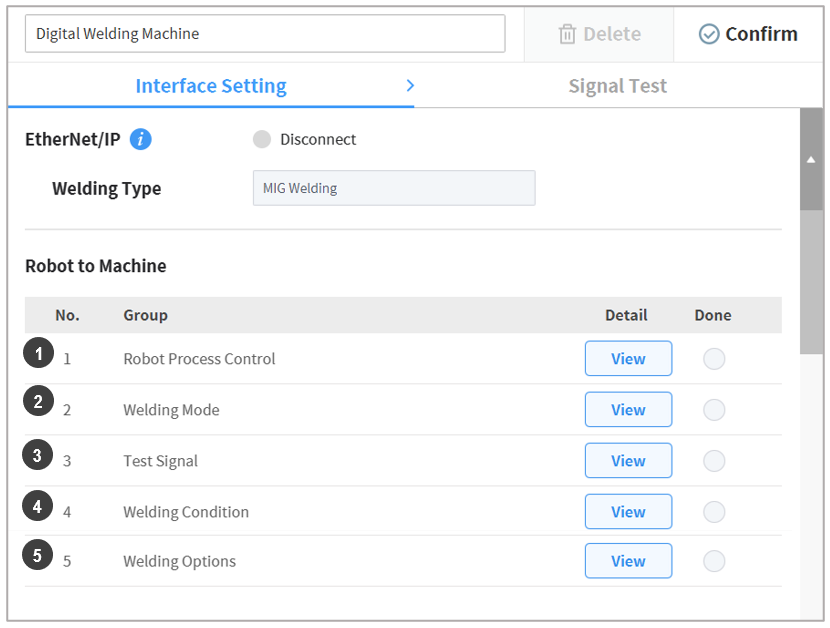Sets the signals sent from the robot to the welding machine. From the image below, set the ➊Robot Process Control, ➋Welding Mode, ➌Test Signal, ➍Welding Condition, and ➎Welding Options Signal settings.