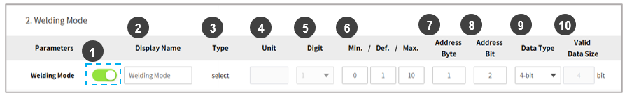 2 | Welding Mode | This sets the welding mode and working mode signals, and it can also set mode signals supported by the welding machine. For more information about specific modes, refer to the corresponding welding machine manual.