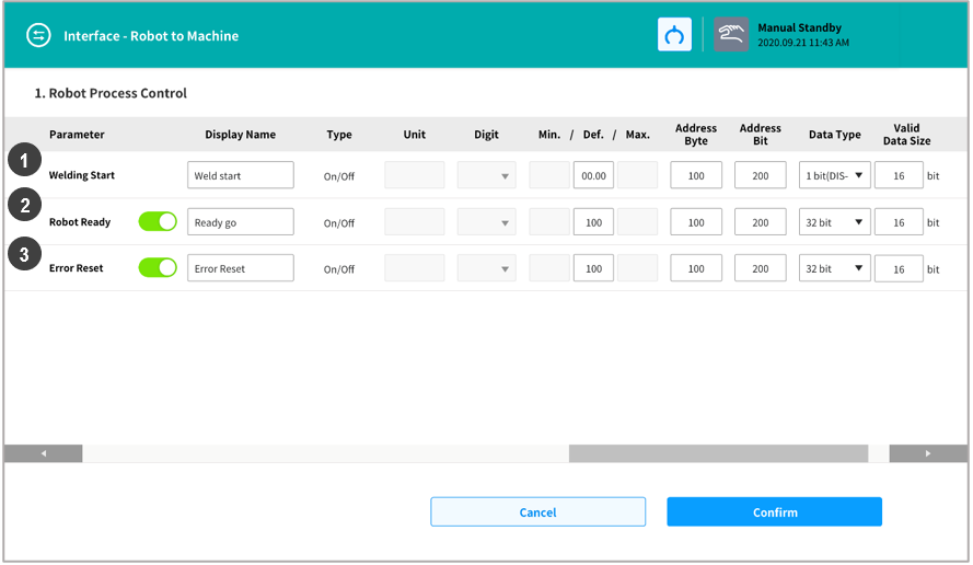 1 | Robot Process Control | (Including mandatory settings) One of the signals sent from the robot to the welding machine, this sets the signals used to link to the robot-welding machine during welding. This includes the Welding Start, Robot Ready, and Error Reset signals. |