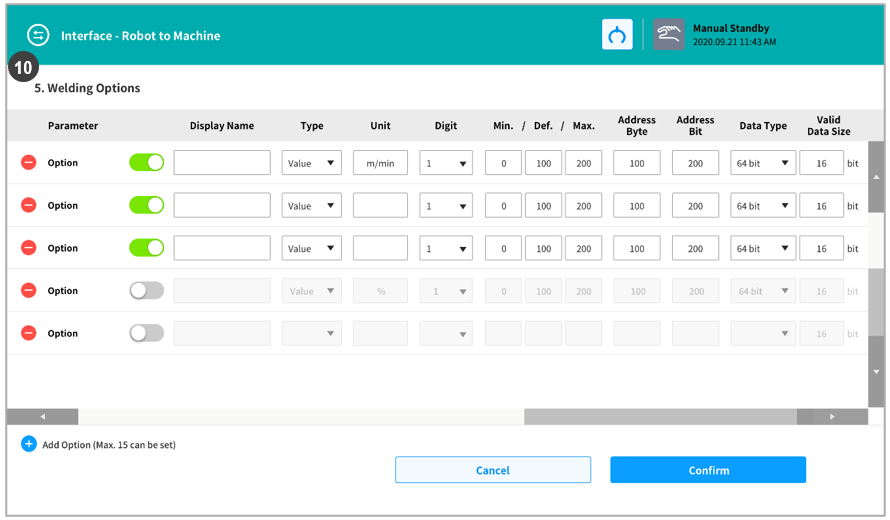 10 | Option 1 - Option 15 | This can be used to designate items other than the basic welding condition items that require welding conditions. |