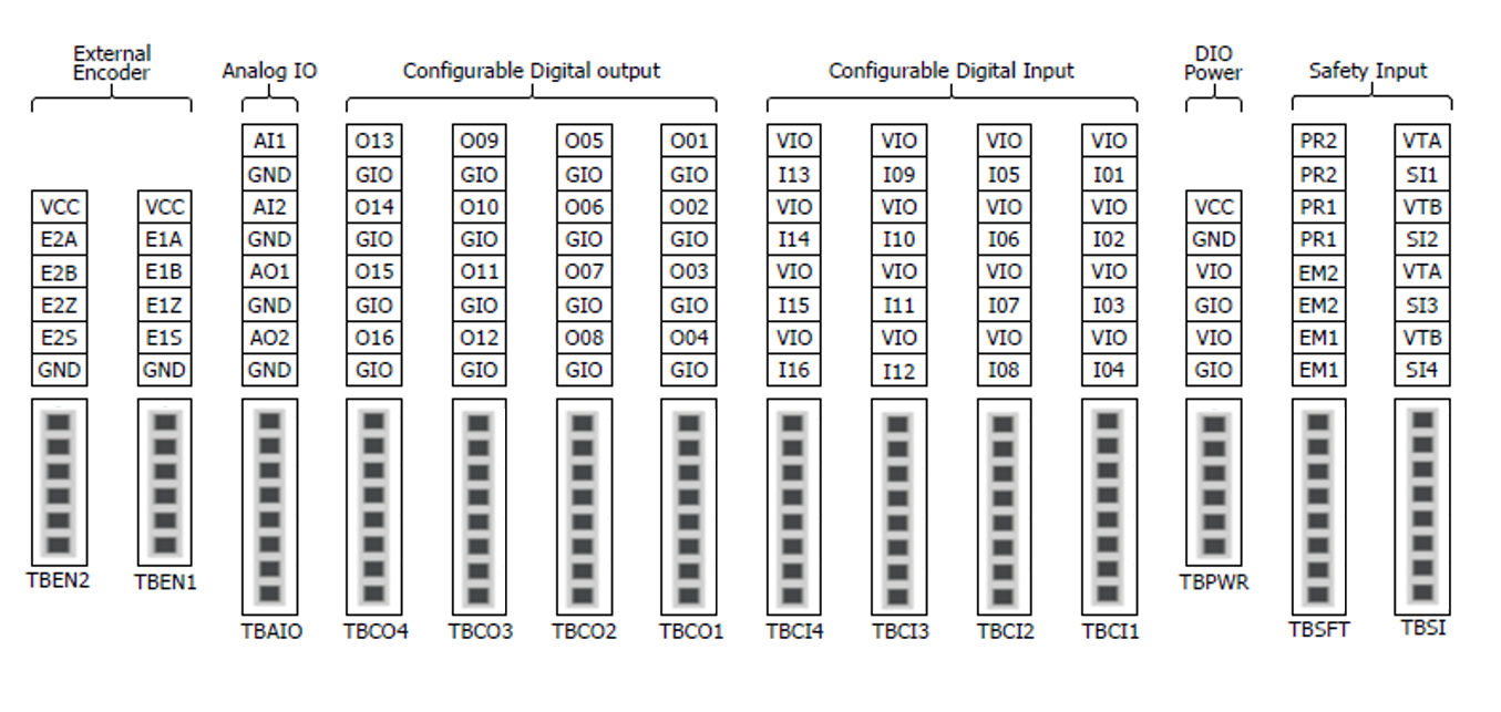 - Bloque de terminales para salida de contacto de seguridad (TBSTO): Para conectar a la línea de alimentación de los periféricos del robot y detener el robot cuando entra en el estado STO cortando también la alimentación a los periféricos