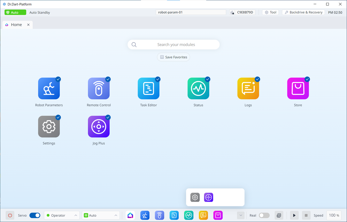 | 3 | Selección de un favorito | En el módulo Home, puede seleccionar módulos para establecer como favoritos. Toque este botón para seleccionar los módulos que desea configurar como favoritos directamente desde los módulos instalados actualmente en la pantalla de inicio. Una vez que haya seleccionado un módulo, toque el mismo botón cambiado a Guardar favoritos para finalizar la configuración de favoritos. La eliminación se realiza de la misma manera.
