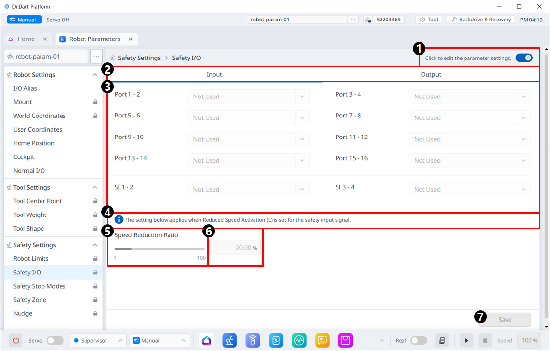 - La señal de seguridad E/S) se puede configurar en Parámetros del robot > Ajustes de seguridad > E/S de seguridad.