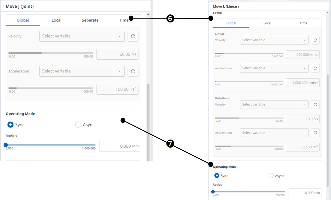 Async inicia el siguiente comando simultáneamente cuando comienza el comando de movimiento. Se utiliza para conectar suavemente diferentes movimientos, y también se utiliza cuando la salida de señal se enciende / apaga simultáneamente cuando el movimiento comienza.