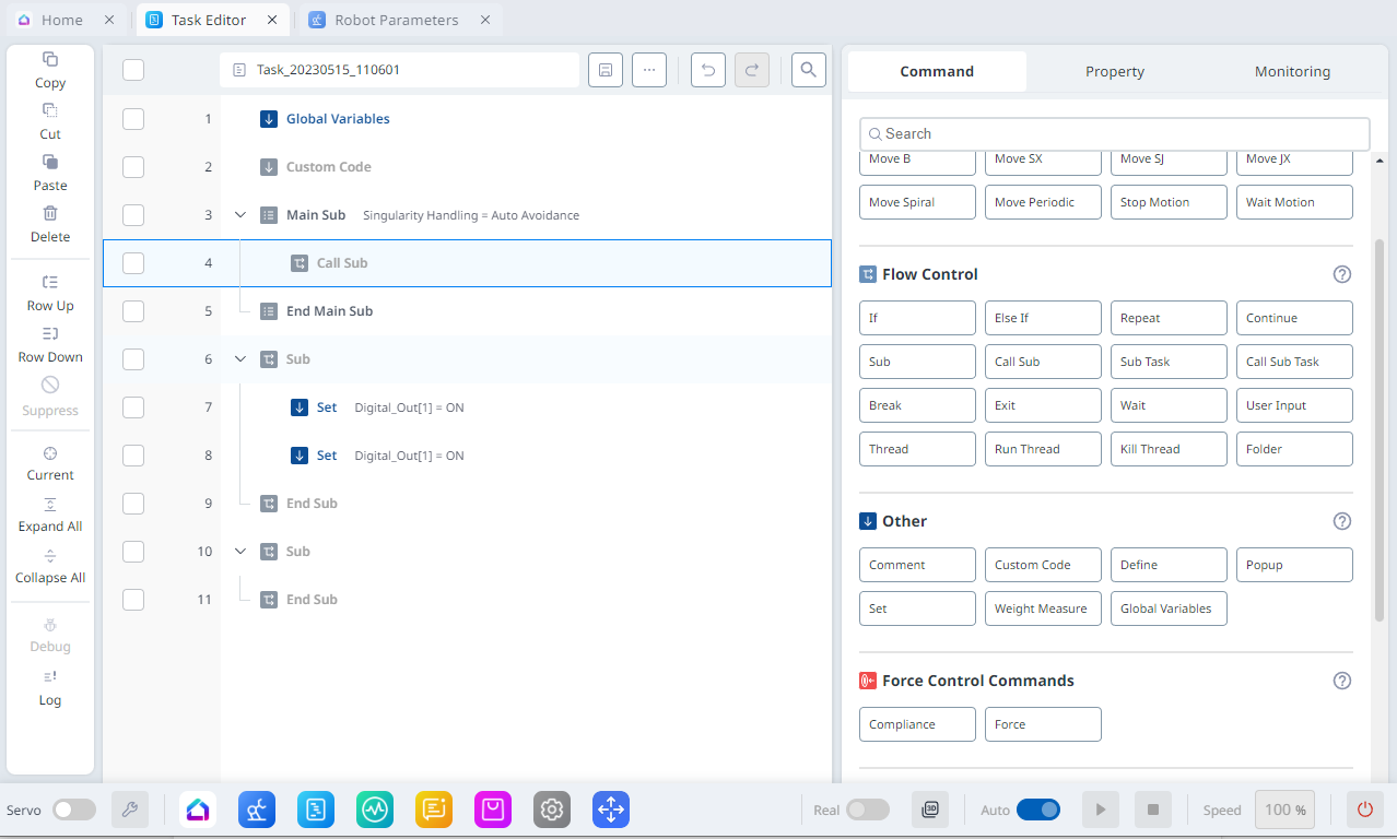 Los robots de Doosan Robotics proporcionan un comando CallSub para llamar a los comandos Sub y el subpárrafo correspondiente.