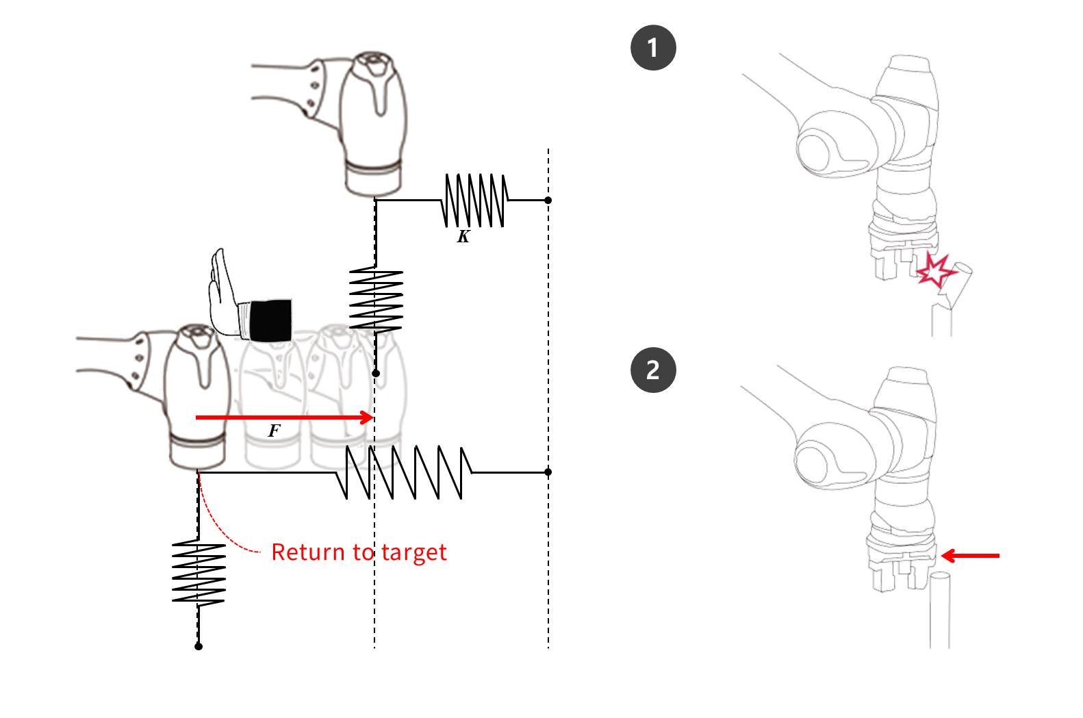 Según las fórmulas anteriores, si la rigidez del control de cumplimiento se establece en 1000N/m y si el robot se mueve 1 mm, la fuerza externa generada es 1N.