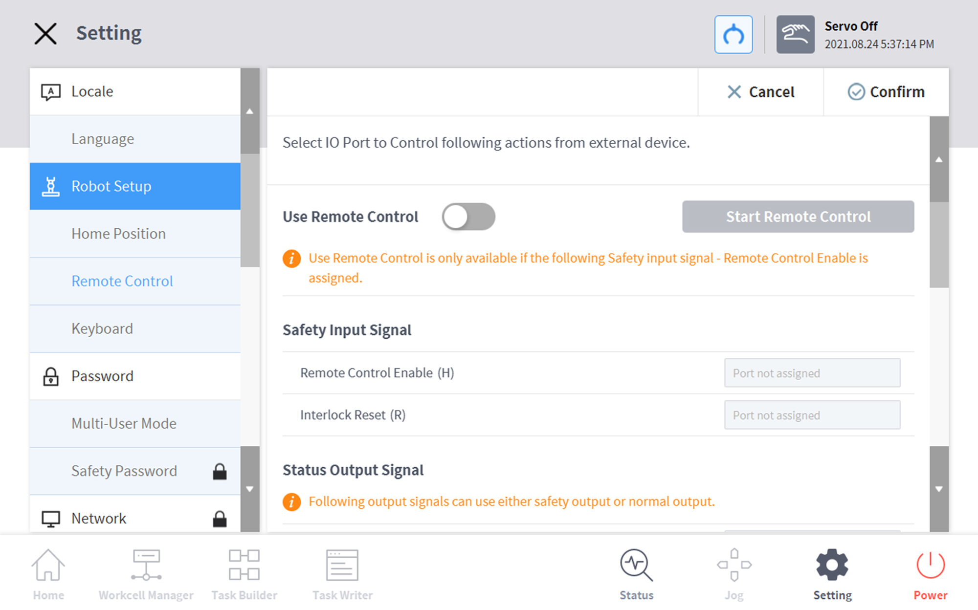 - Seleccione el menú Control remoto en el menú Configuración > Configuración del robot.