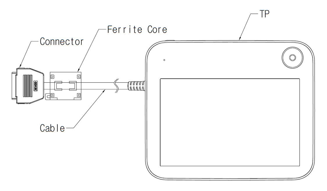 - Si el ruido generado por las ondas electromagnéticas influye en el teach pendant, es necesario instalar un núcleo de ferrita para garantizar un funcionamiento normal. La ubicación de la instalación es la siguiente: