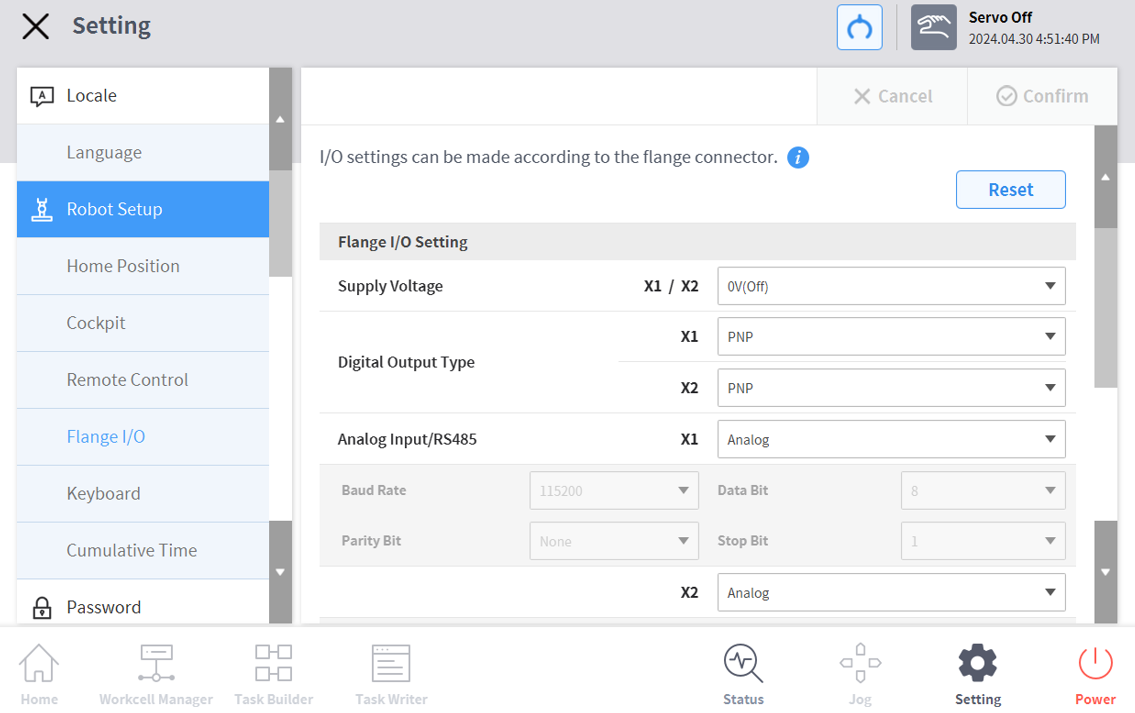 En el área del menú Configuración, seleccione el menú E/S de brida en Configuración del robot (solo visible cuando se conecta una nueva brida)