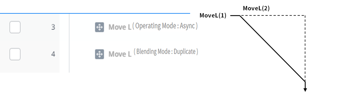 Async démarre la commande suivante simultanément lorsque la commande de déplacement commence. Il est utilisé pour connecter en douceur différents mouvements, et il est également utilisé lorsque la sortie de signal est activée / désactivée simultanément lorsque le mouvement commence.