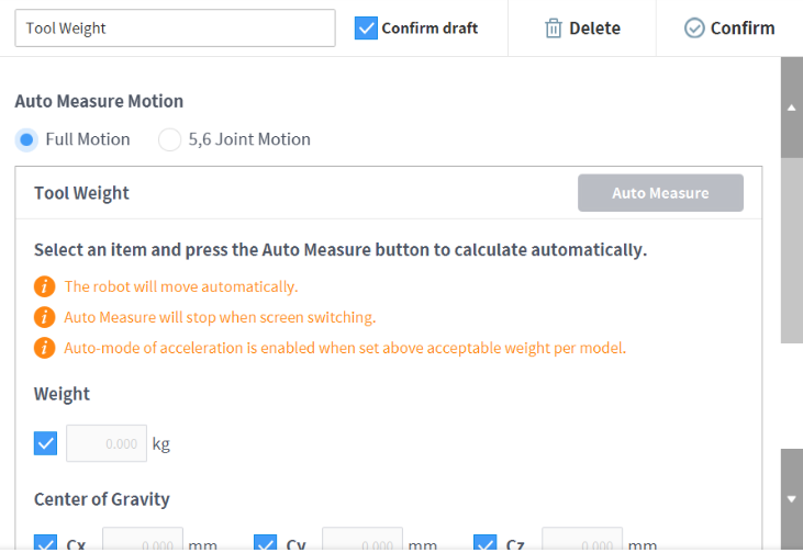 - All Motion (Tout mouvement) : Toutes les articulations sont utilisées pour mesurer le poids de l'outil.