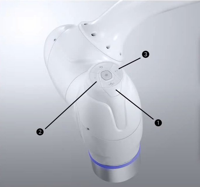 Appuyer sur le bouton du guide de la main à l'arrière de la poignée de commande d'apprentissage pour activer le mode Freedrive, tout comme appuyer sur le bouton 1, et le robot peut être déplacé librement.