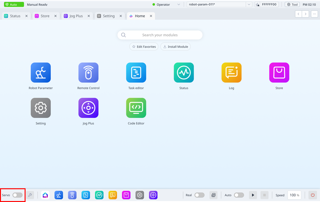 A SERVO on (szervó be) azt a készenléti állapotot jelenti, amelyben a robotkar az ízületek tápellátásával működtethető. A vészleállító gomb megnyomásával vagy a kritikus biztonsági határértékek megsértésével a Szervo kikapcsolt állapota állítható be. A szervo kikapcsolt állapota alatt az ízületek teljesítménye leválik, ami azt eredményezi, hogy a robotkar nem működtethető, és a Task Editor és a Jog Plus, a robotkar működésével kapcsolatos műveletek le vannak tiltva a főmenüben.