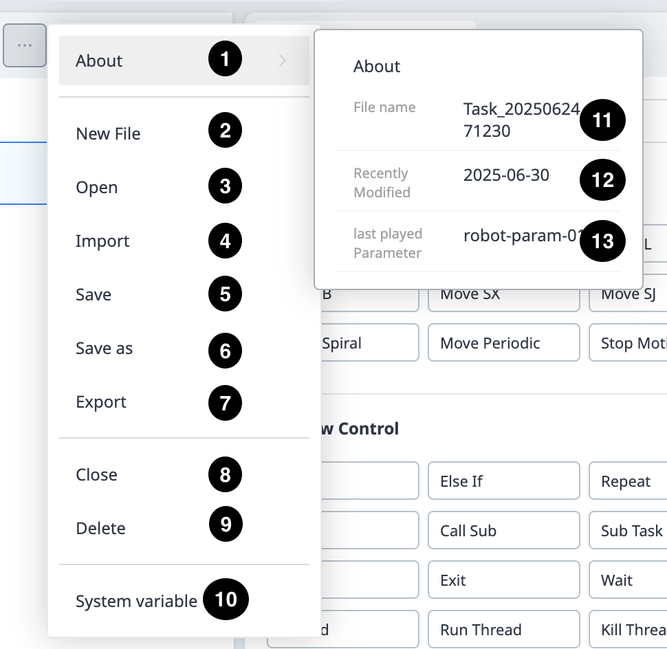 | 10 | Rendszerváltozó | Rendszerváltozók beállítása. A programon belül deklarálhatja és használhatja a rendszerváltozókat, például a robot helyzetét, sebességét és állapotát. Ezek a változók a A változók sorrendjét húzással módosíthatja. ![]() A rendezési sorrendet a táblázat oszlopfejléceire (Név, dátum) kattintva módosíthatja. ![]() |