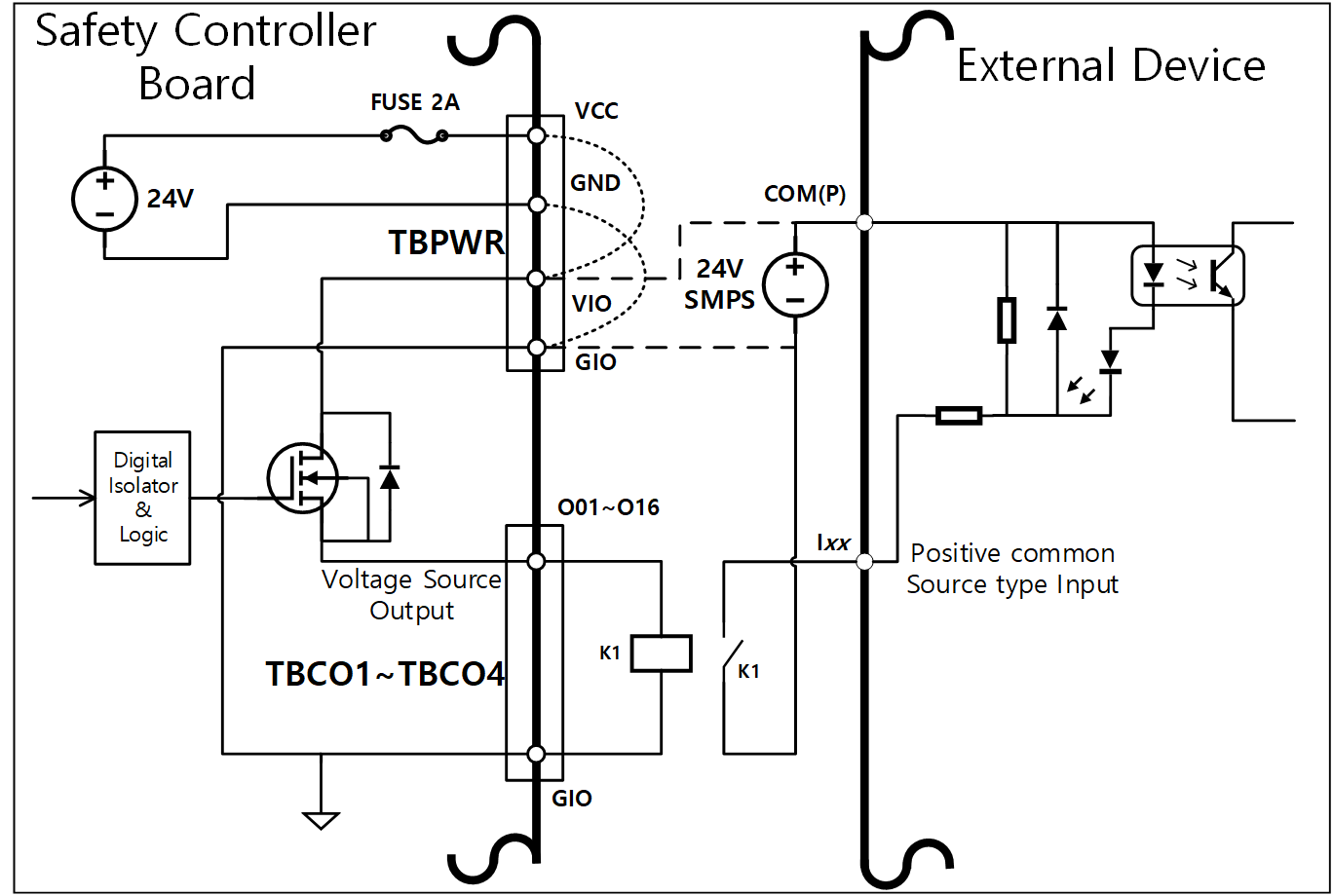 Noha a biztonsági érintkező kimeneti érintkező (TBSFT) kapcsa csak száraz érintkező típusú jelekkel csatlakoztatható, biztonsági I/O-ként beállított bemenet érintkező és feszültség típusú jelekként egyaránt csatlakoztatható. Biztonsági I/O-ként beállított kimenet feszültségjeleket visz ki, de érintkező típusú jeleket is kivihet külső jelfogó hozzáadásával.