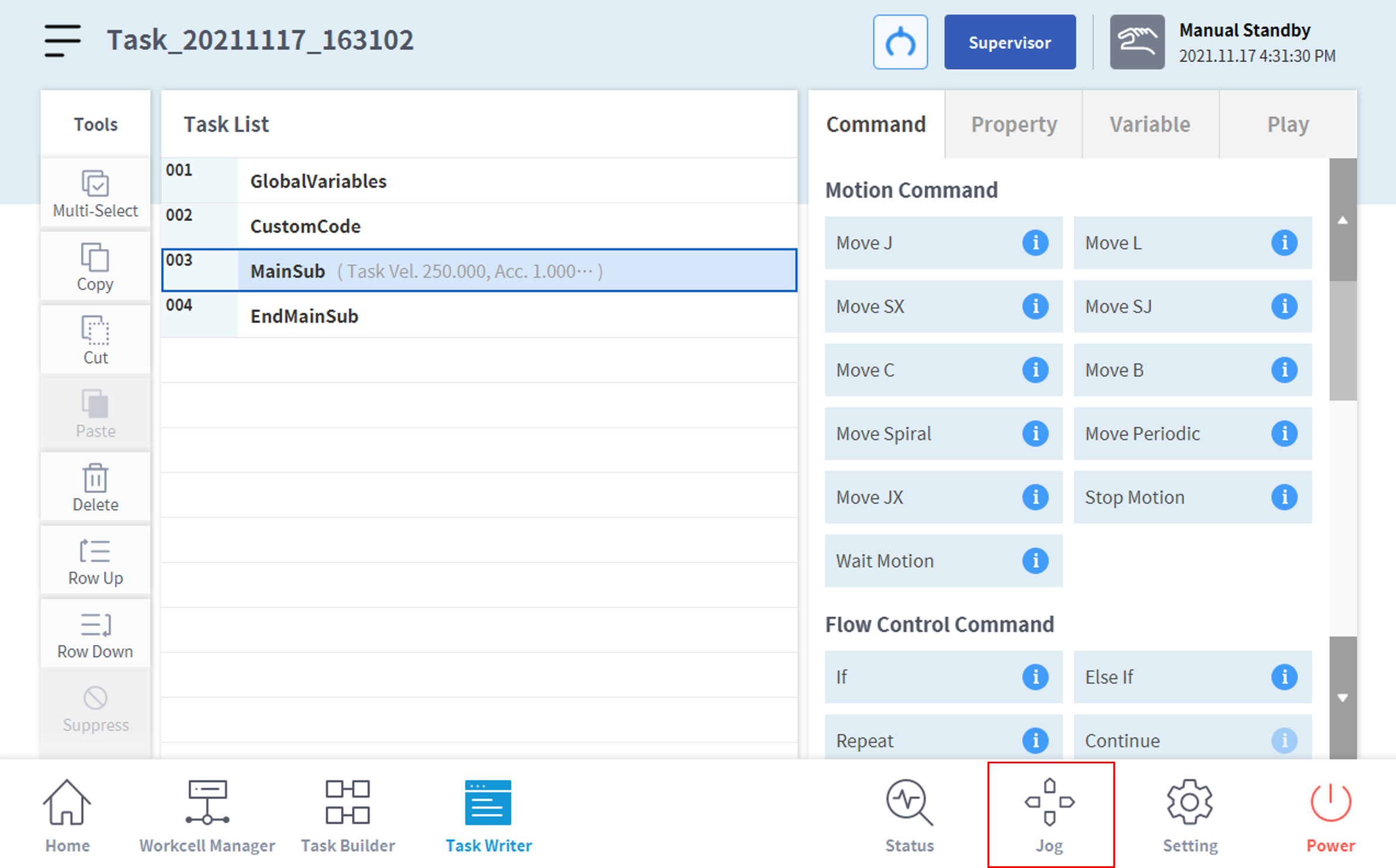 4 | Select Axis | Kiválasztja a mozgatni kívánt tengelyt. Csukló fül: Válasszon egy tengelyt a J1 - J6 közül. Feladat fül: Válasszon egy tengelyt az X - Rz közül. |