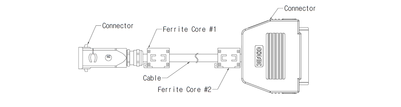 - Ha a vezérlőt befolyásolja az elektromágneses hullámok keltette zaj, a normál működés biztosítására a manipulátor kábelének mindkét oldalára ajánlott ferritmagot felszerelni. A telepítés helye az alábbi módon néz ki: