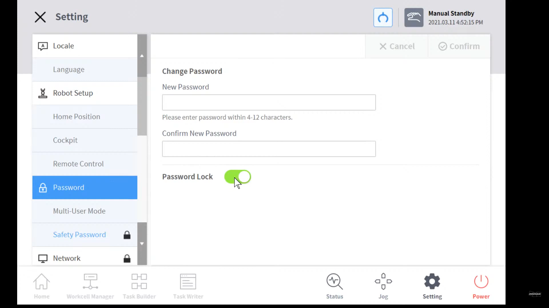 Érintse meg a Jelszózár billenőkapcsolóját a Jelszózár funkció kikapcsolásához. Ezután minden jelszó-zárolási funkció le lesz tiltva, amíg a vezérlőt újra nem indítják.