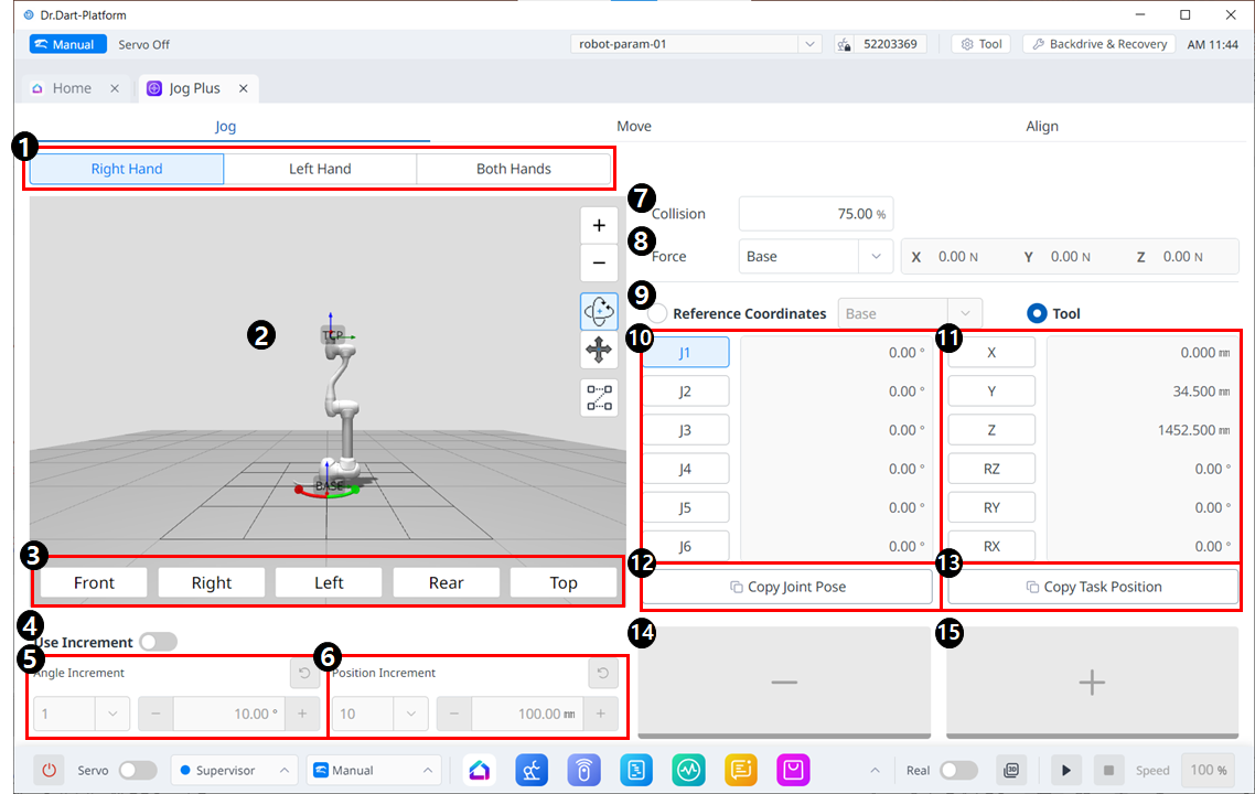 | 14 | Sposta - Pulsante | È possibile far muovere il robot nella direzione - in base a ciascun asse. A questo punto, puoi capire la direzione di - e + nella simulazione 3D sul lato sinistro. |