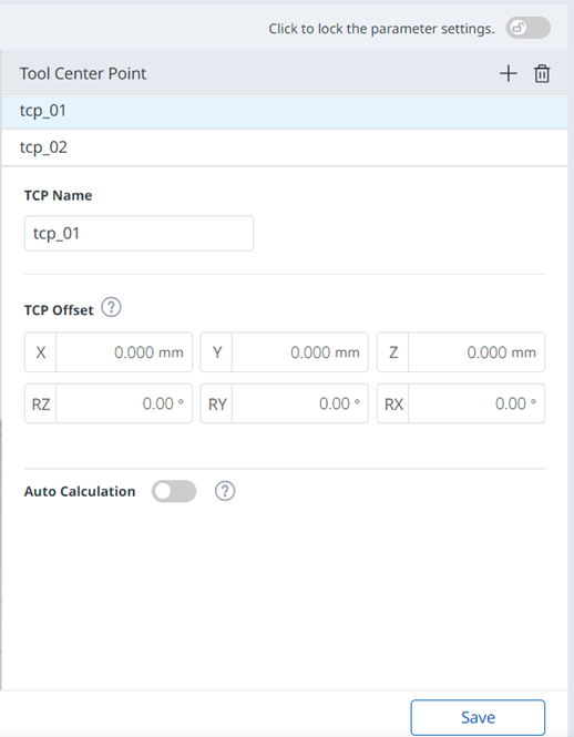 La forma utensile può essere impostata nel modulo robot Parameters (parametri robot) > Tool Settings (Impostazioni utensile) > Tool Shape (forma utensile). Per ulteriori informazioni, fare riferimento a forma utensile.