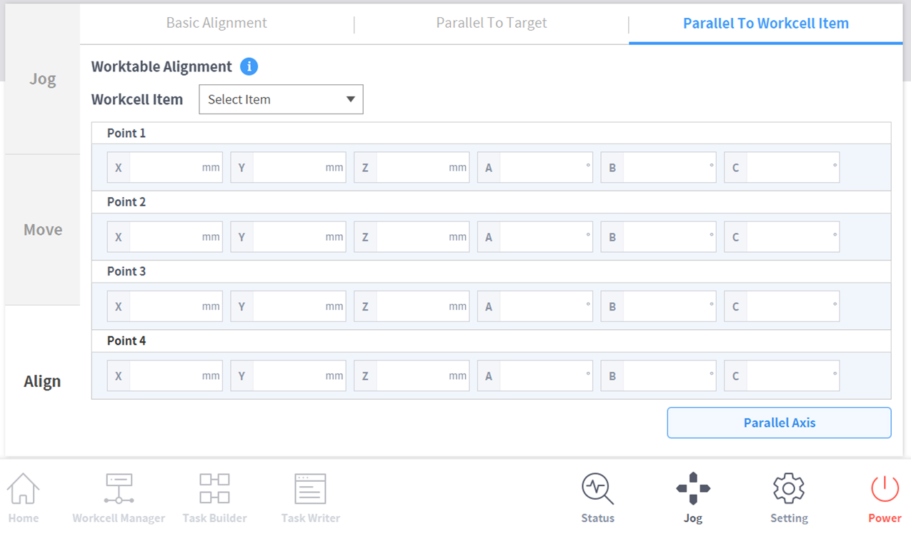 - Selezionare la schermata Align (Allineare) e selezionare la scheda Parallel To Workcell Items.