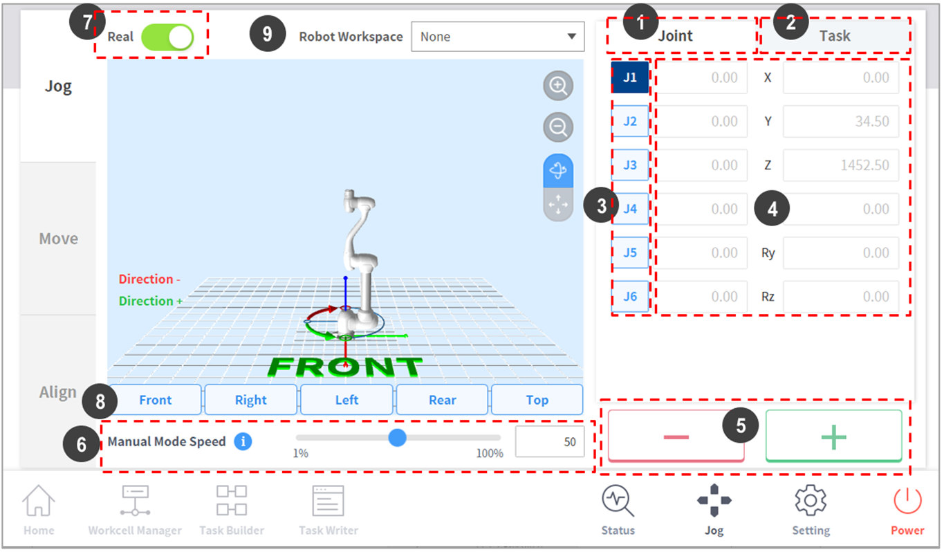 6 | Manual Mode Speed | Configura la velocità di movimento del robot in modalità manuale. La velocità può essere regolata trascinando il cursore. Se il cursore è al 100%, la massima velocità del giunto corrisponde sulla scheda Jog è 30 gradi/s e la massima velocità dell'attività è 250 mm/s. Questa velocità influenza la velocità controllata dai pulsanti jog e di movimento. |