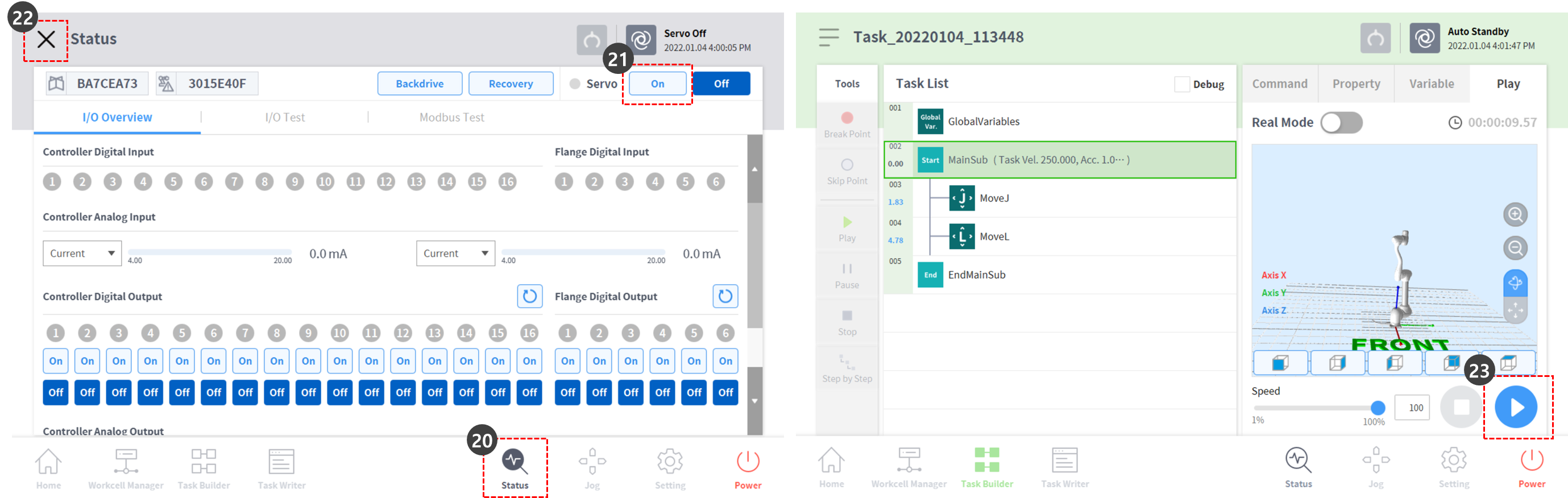 Impostare il pulsante di attivazione della modalità reale sullo stato di attivazione (verde) per azionare il robot effettivo.