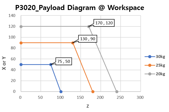 Il carico utile massimo del robot all'interno del suo spazio operativo varia in base alla distanza dal baricentro. Il carico utili in funzione della distanza è il seguente: