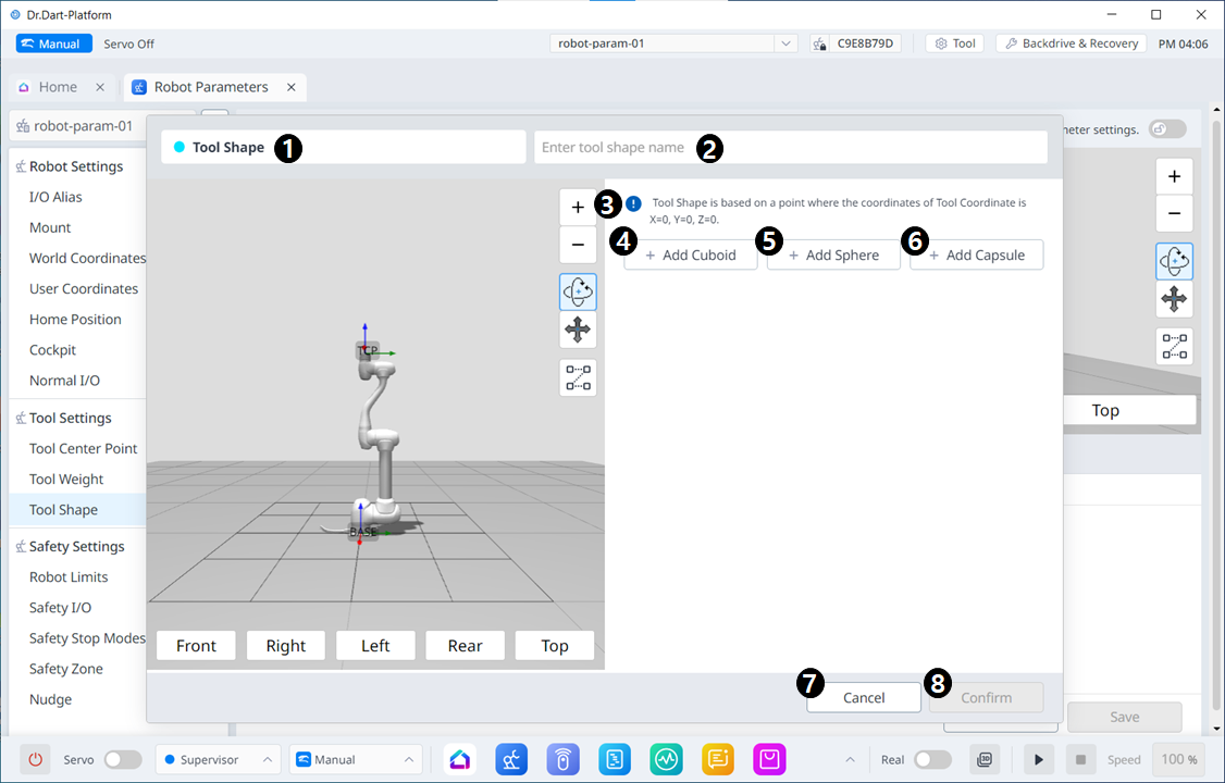 工具形状は 、[ロボットパラメーター(Robot Parameters)]モジュール> [工具設定(Tool Settings)] > [工具形状(Tool Shape)]で設定できます。詳細については、 『工具形状の設定』を参照してください。