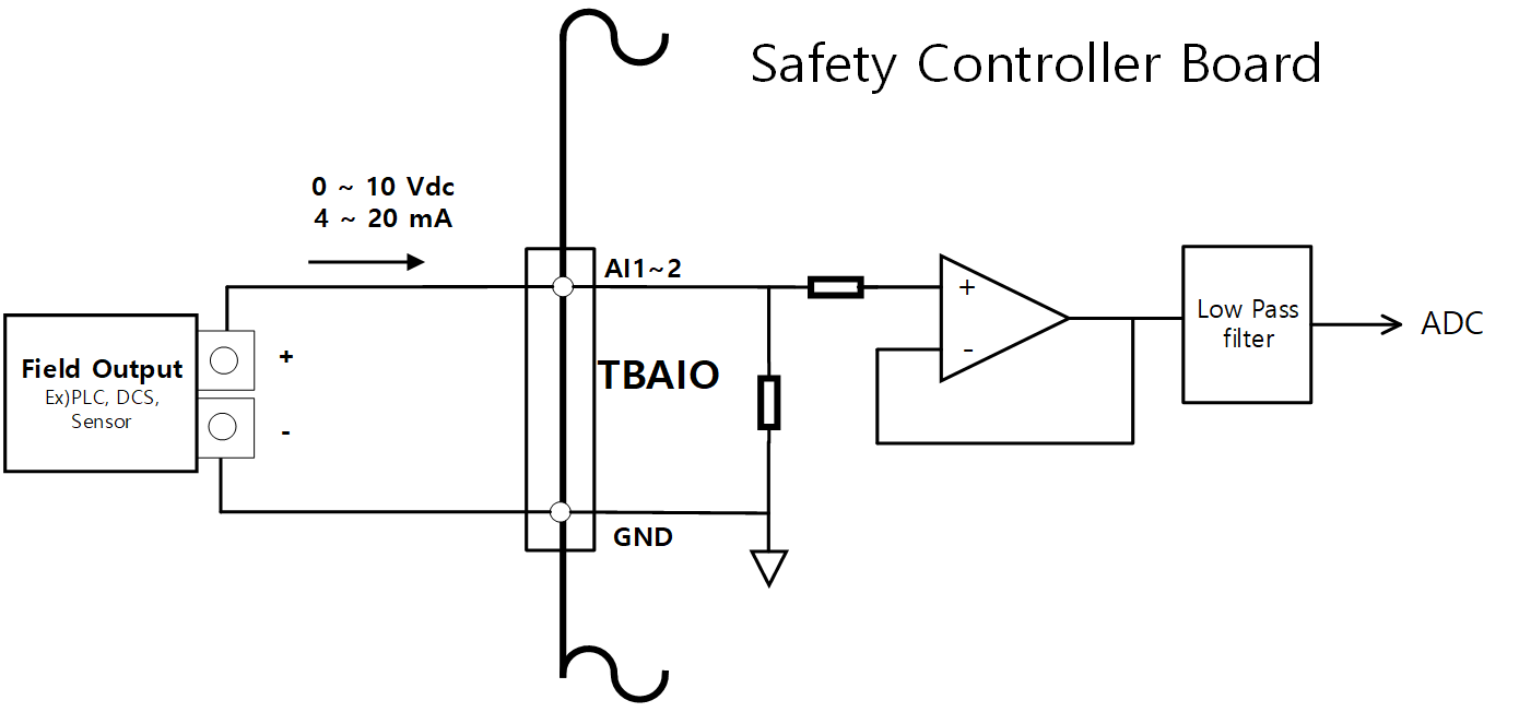 TBAIO端子ブロックのALx端子とGND端子の間で、外部デバイスから電圧または電流信号を受信します。デバイスの出力が電圧信号の場合、0~10Vdcの信号を受信します。デバイスの出力が電流信号の場合、4~20mAの信号を受信します。