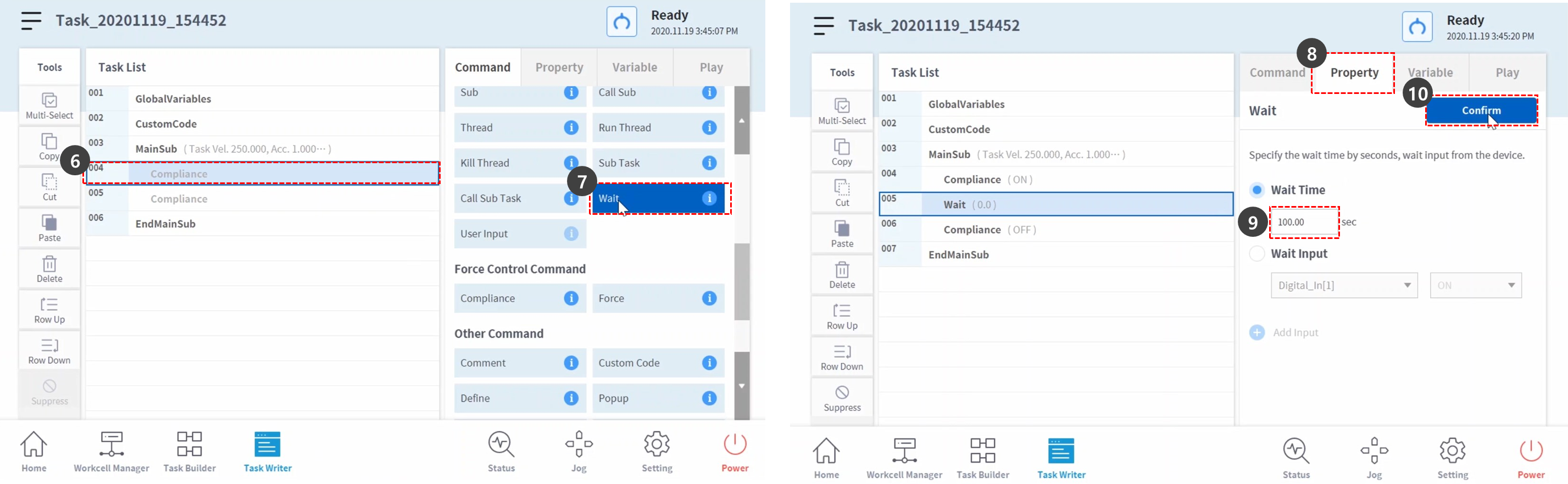 - コンプライアンス制御中は、 MoveJ コマンドなどのジョイント動作を実行できません。