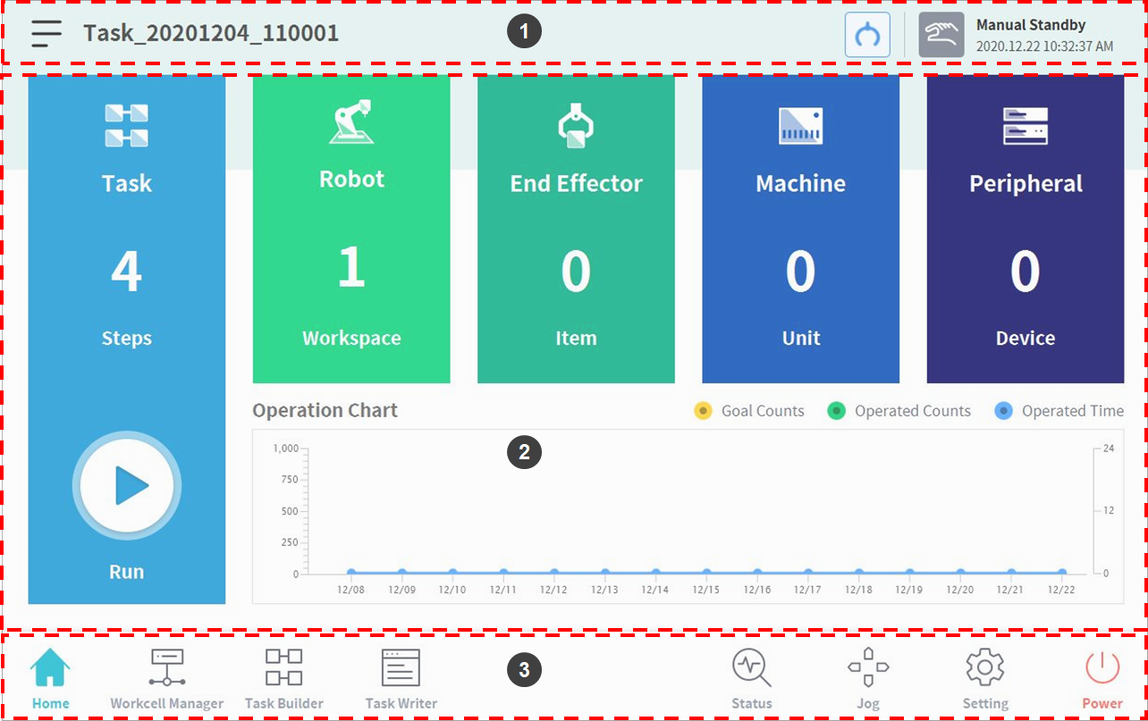 1 | Status Display Area | 実行中のタスク名とロボットの現在の作業状態が表示される領域です。 |