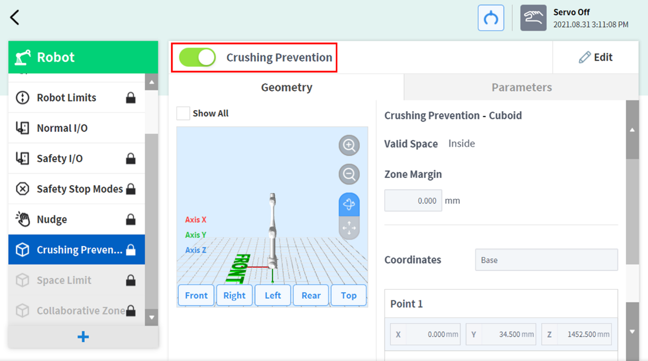 追加ボタンをタップ後、狭窄防止区域 > キューブ、円柱、多面ボックス、球、傾いたキューブタイプのうち一つを選択してください。設定時、有効化する場合はSafety Passwordの入力が必要です。