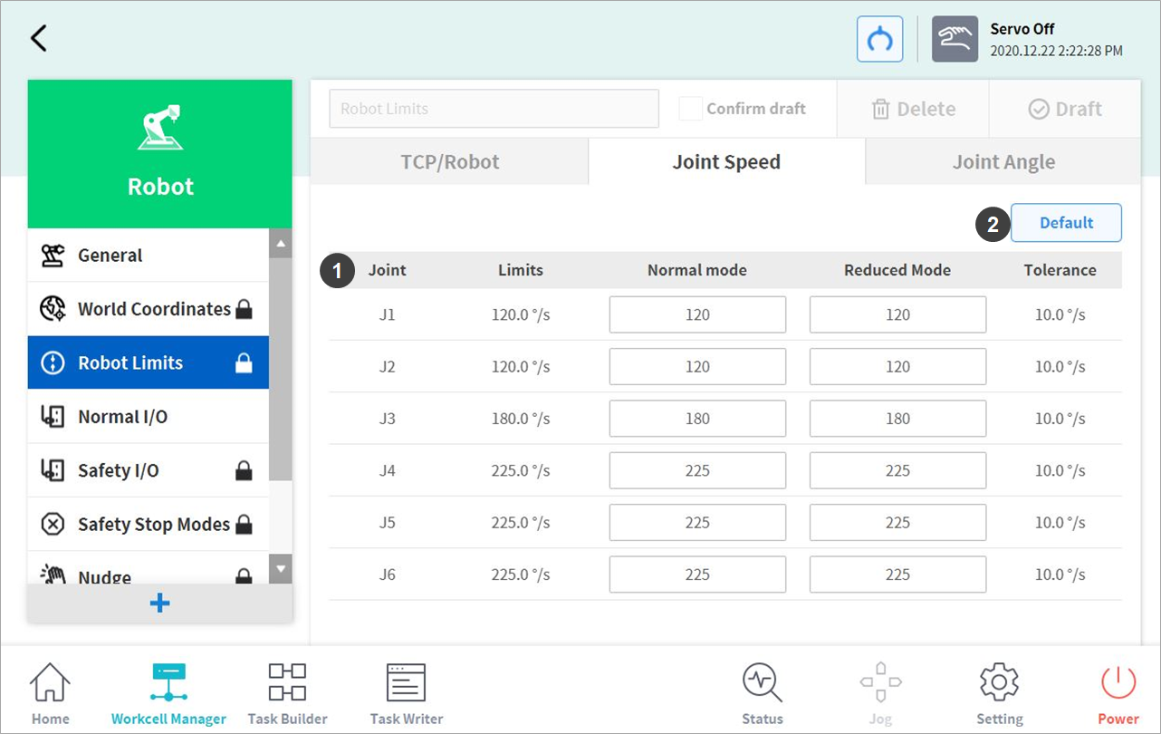 6 | Default Value | ツール中心点/ロボット制限値の設定を基本値に変更します。 |