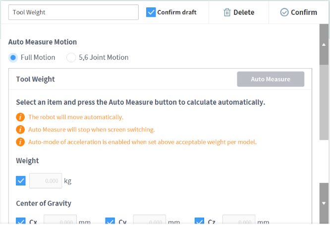 - 全体動作:全体ジョイントを利用してツール重量を測定します。