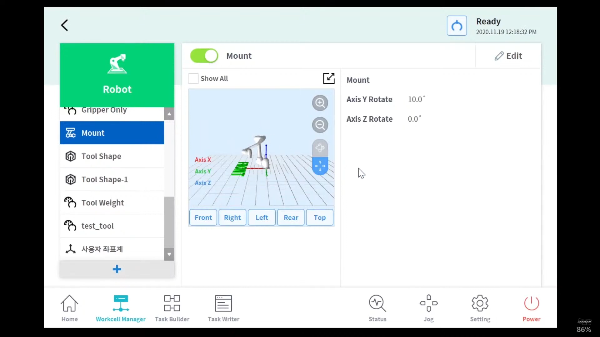 ロボットのインストールポーズは、ロボットのインストールポーズ(マウント)ワークセル項目を追加することで設定できます。ロボットが平面にインストールされている場合は、このステップをスキップできます。