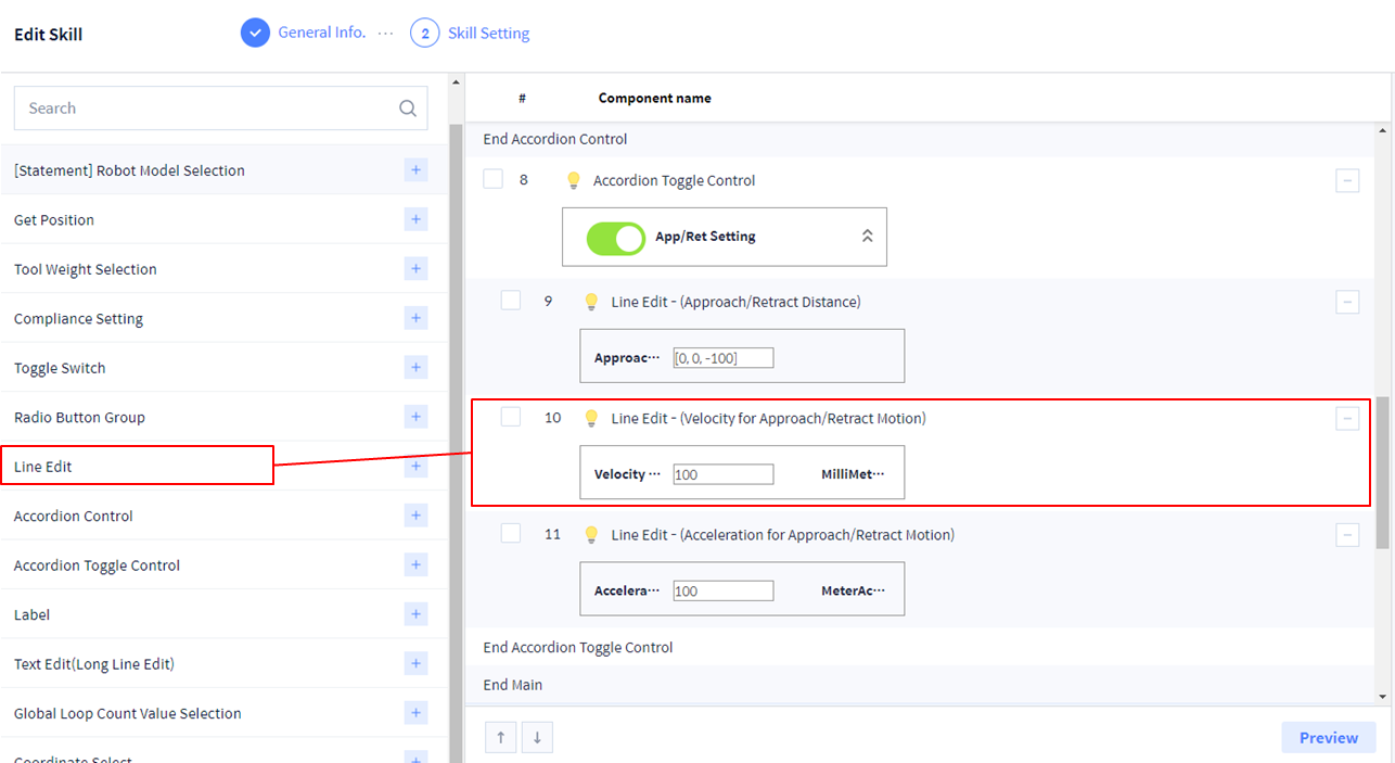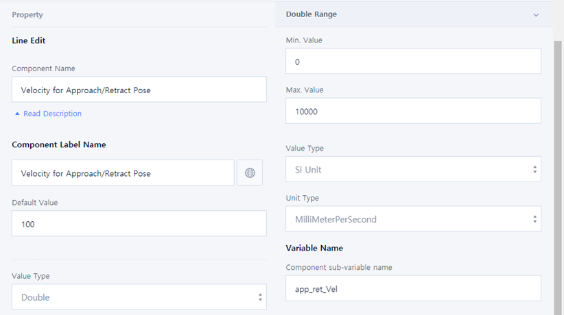 'Line Edit' UI Component를 사용하여 값을 입력할 수 있는 창을 추가할 수 있습니다. 입력 창에는 속도 값이 입력되도록 구성하십시오.