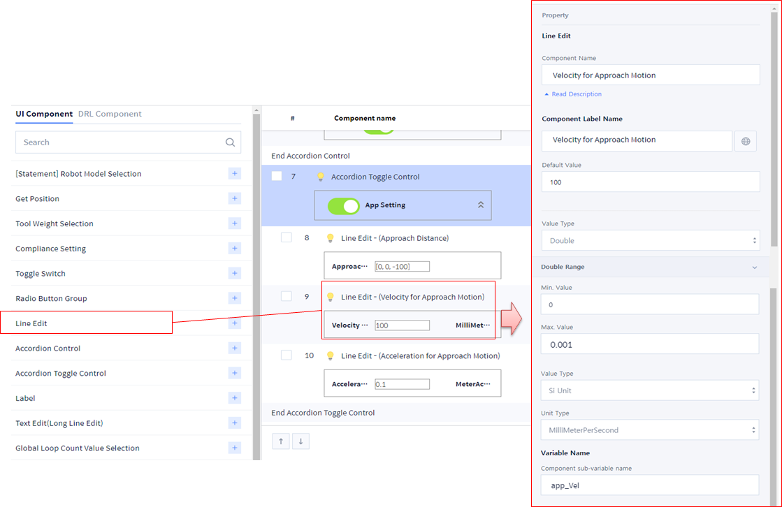 사용자가 Velocity 값을 입력할 수 있도록 UI Component > Line Edit을 추가합니다.
